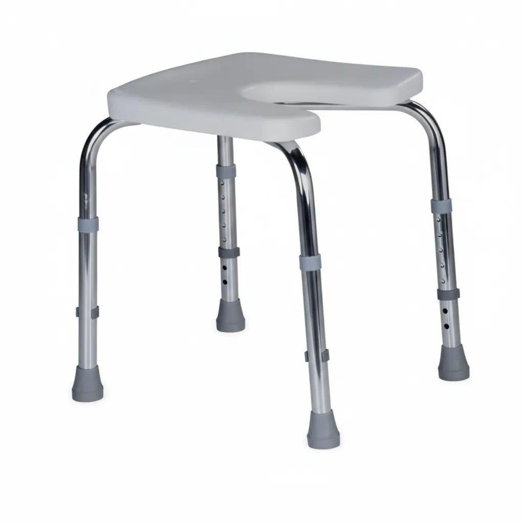 Estructura de aluminio, con tornillos de acero inoxidable Resistente al agua: Totalmente Asiento: plástico con escotadura para facilitar el lavado del paciente Regatones: 25mm gris Terminación: Anodizado Color: Plateado Profundidad de asiento: 37cm Ancho de asiento: 40cm Ancho total: 45cm Altura de asiento: 40-58cm Peso máximo del usuario: 100Kg Peso total: 2,5Kg