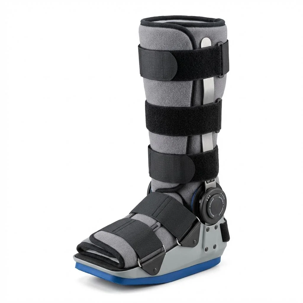 Indicaciones: Esguinces severos de tobillo, fracturas distales de tibia y peroné, período postquirúrgico, rehabilitación. Bota construida en duraluminio estampado y pintado, su interior está revestido con un acolchado suave y confortable. Posee una exclusiva articulación en acero inoxidable que otorga un rango de movimiento (ROM) incremental en 10°, entre 40° de flexión plantar y 20° de flexión dorsal.