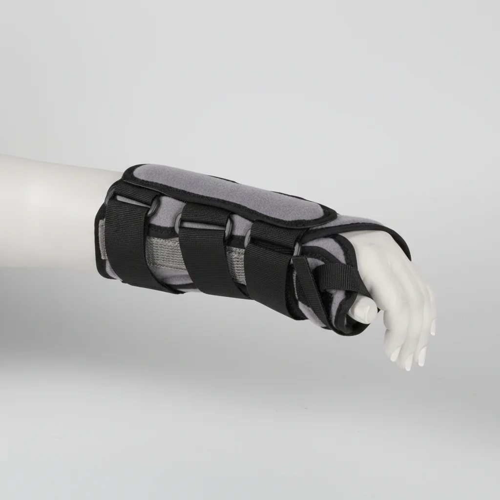 Indicaciones: Post operatorios, fracturas carpianas, fracturas metacarpianas. Inmovilizador de tela acolchada con ballenas de aluminio. Puede seleccionarse con velcro o hebillas.