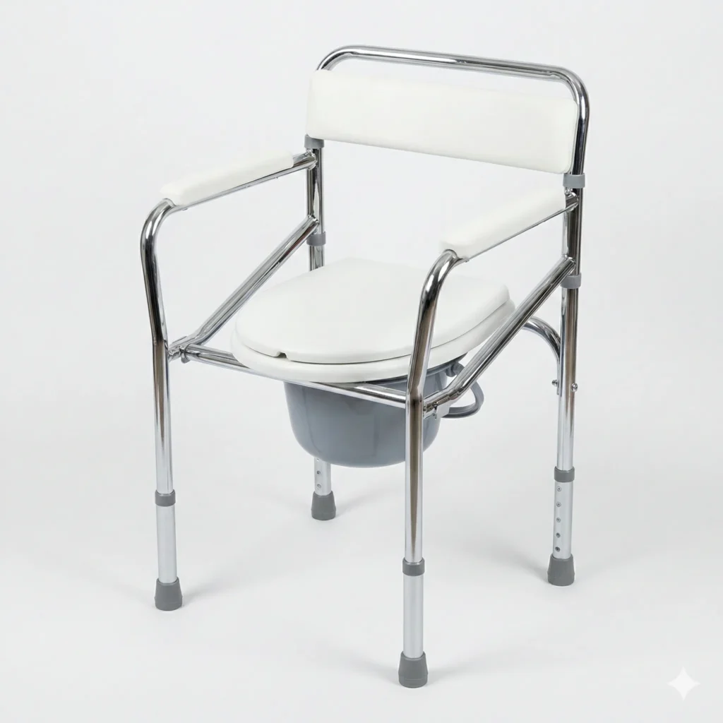 Inodoro portátil plegable con estructura de acero, apoyabrazos y respaldo. Asiento y tapa rebatibles y desmontables. Patas de aluminio regulables en altura. Incluye bacinilla plástica con tapa y manija. Terminación cromado. Soporta un peso máximo de 100Kg.
