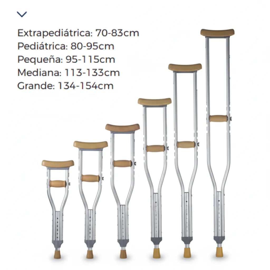 Muleta fabricada en aluminio ultraliviano con terminación anodizado color Natural. Axilera y empuñadura de goma espumada. Totalmente regulable. Soporta un peso máximo de 120Kg. Disponible en tamaños Pequeña, Mediana y Grande.